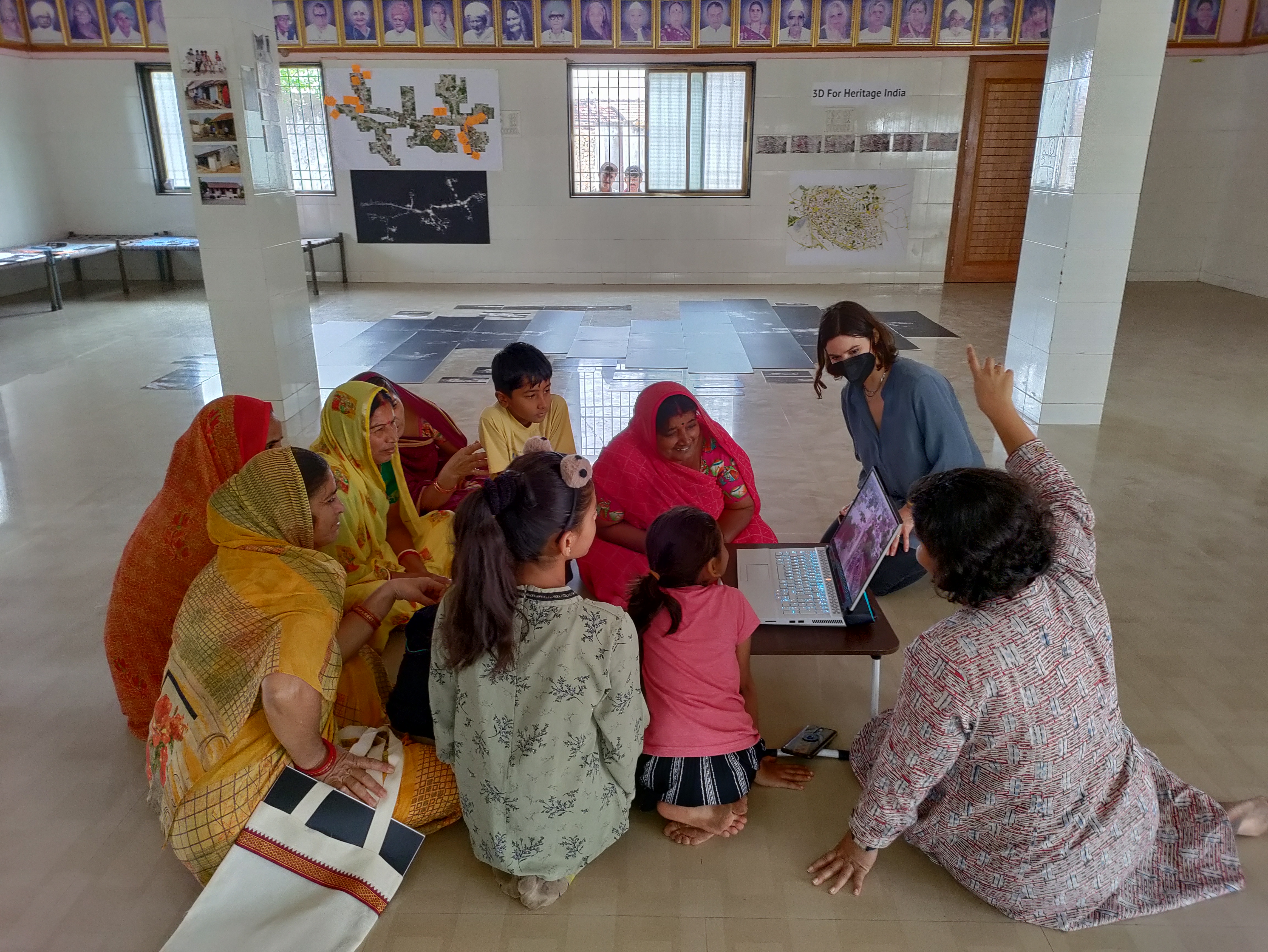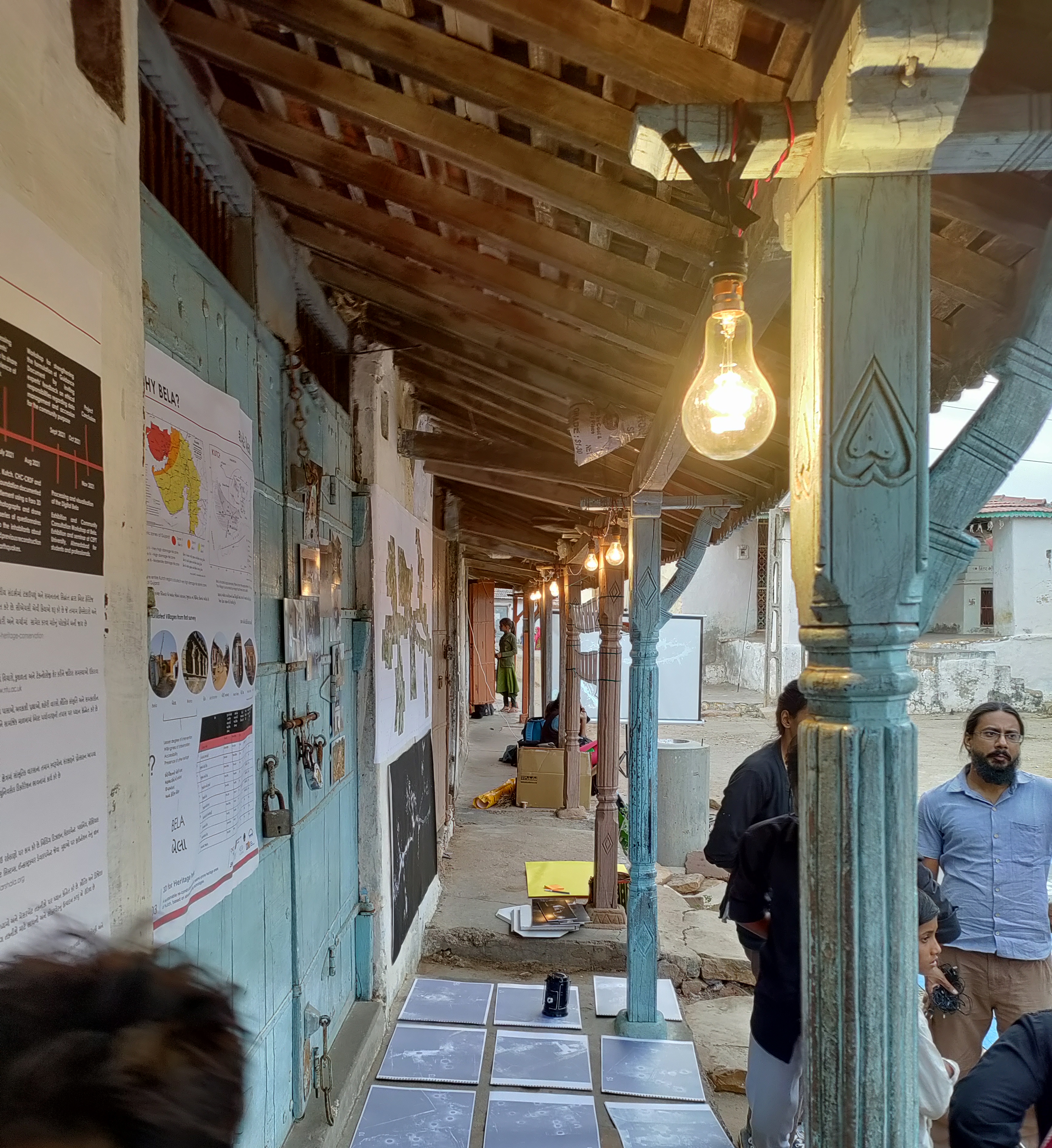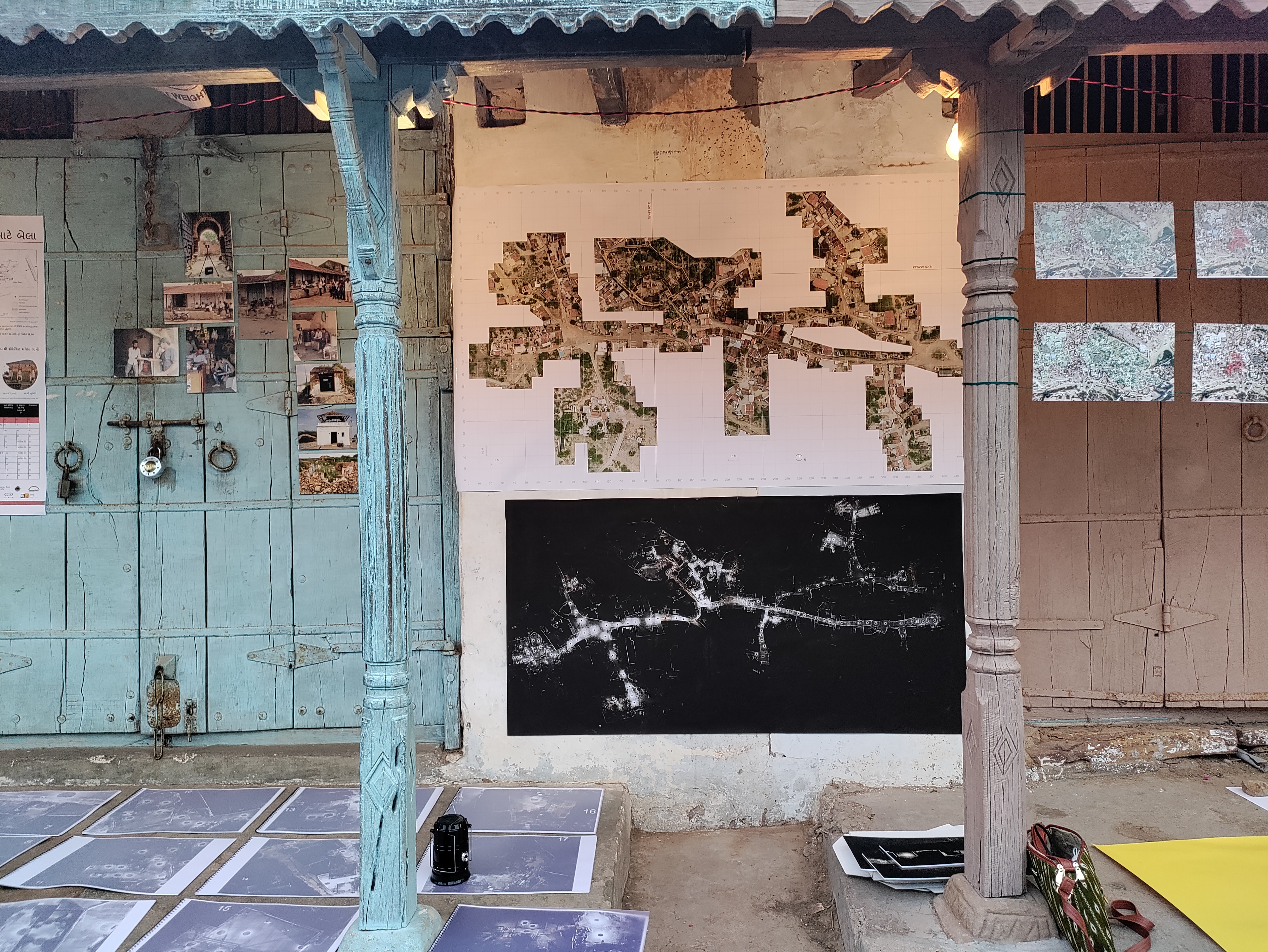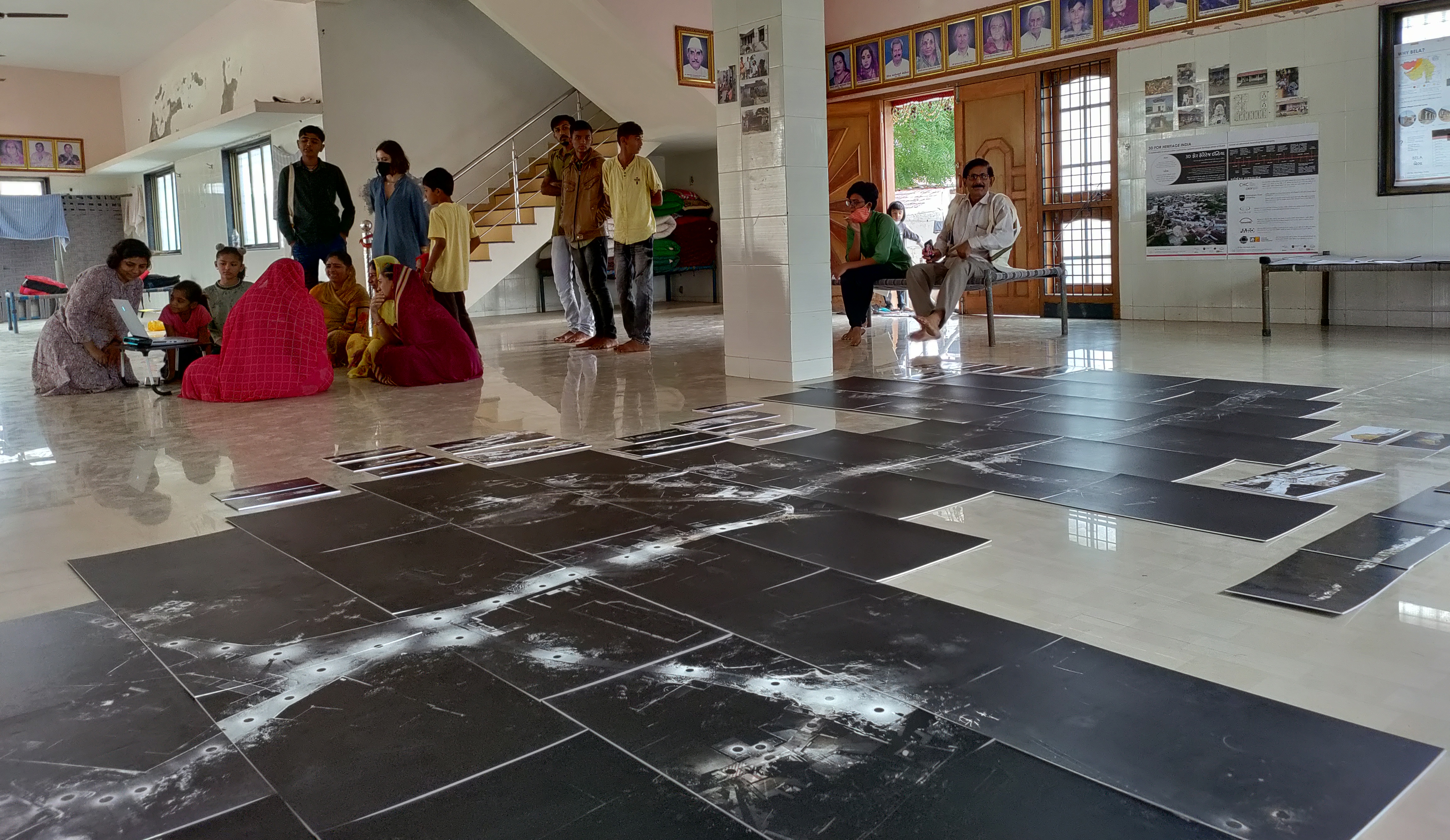 The exhibition consisted of a large plan of Bela at 1 to 100 scale, showing the 18 buildings that were interiorly scanned. For each one of them, a booklet compiling, plus videos, plans and images of individual buildings based on the 3D scan model of the village and the traditional houses of Kutch obtained in June/July 2021. The exhibition also included drone imagery, social survey information, and jigsaw puzzles especially designed for children to play and engage with their environments. This exhibition (held at Bela, Kutch) was then recreated at the CHC CRDF campus in Ahmedabad for CEPT University’s students, along with a seminar for further disseminating and discussing the project.