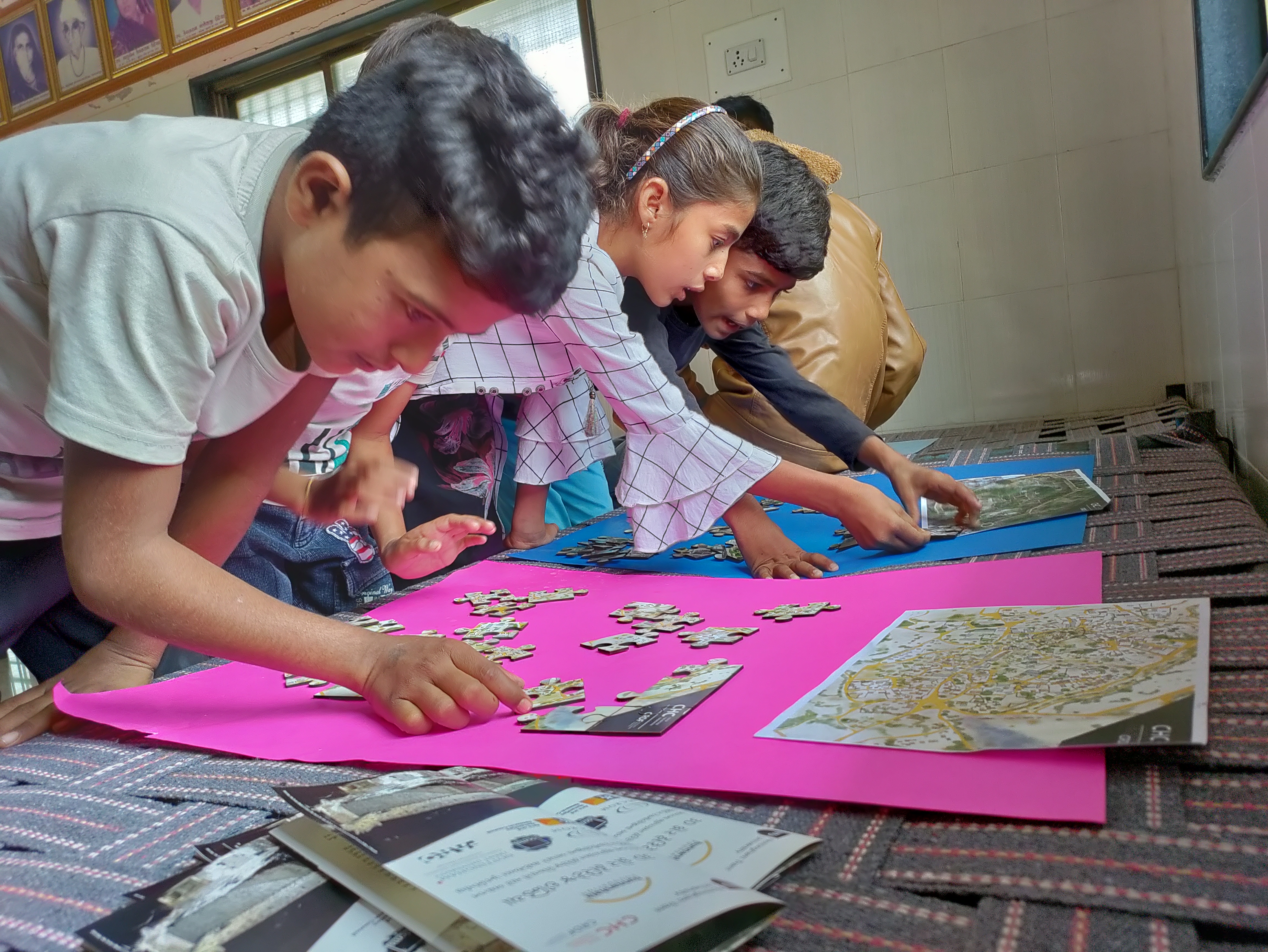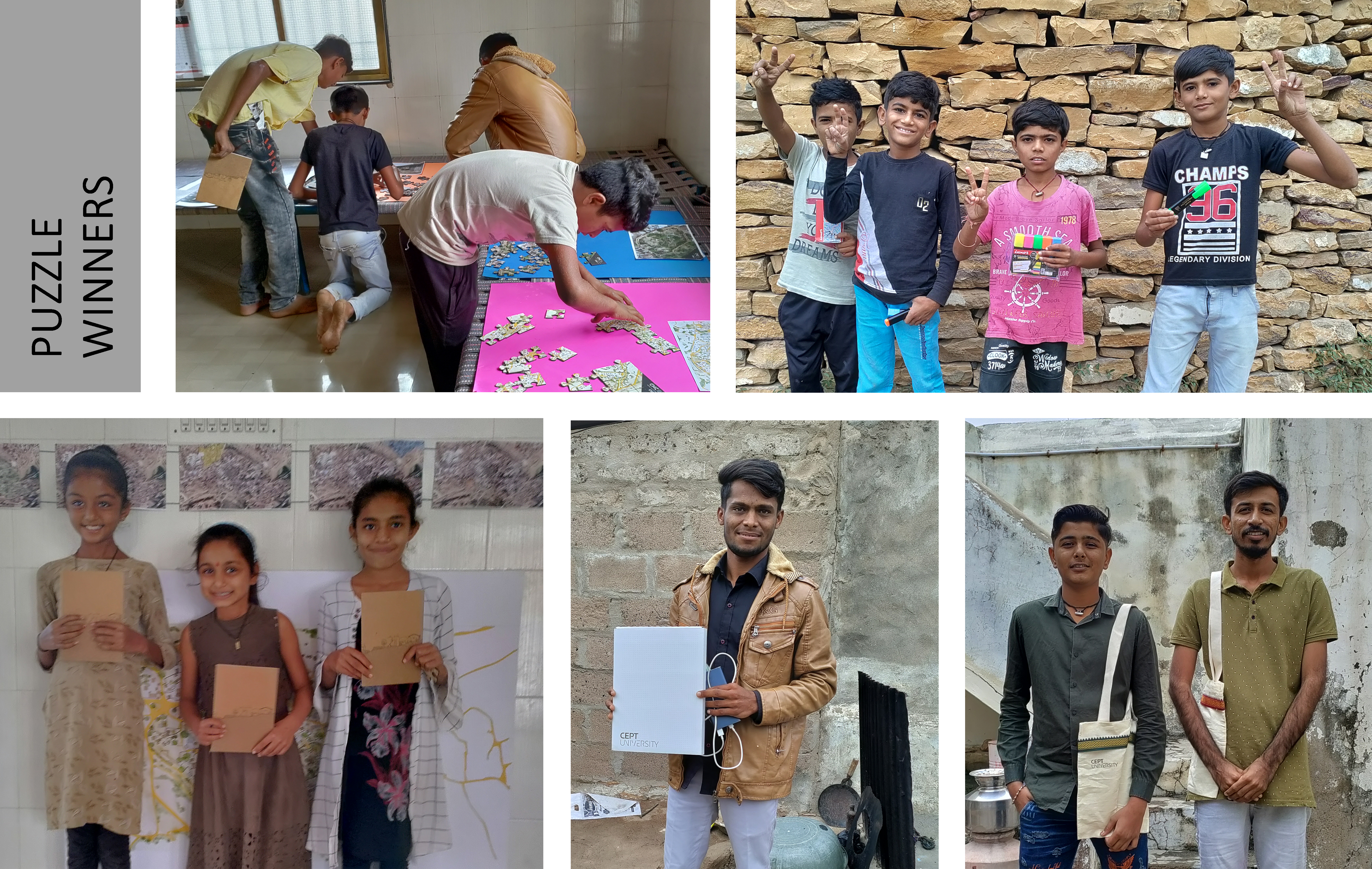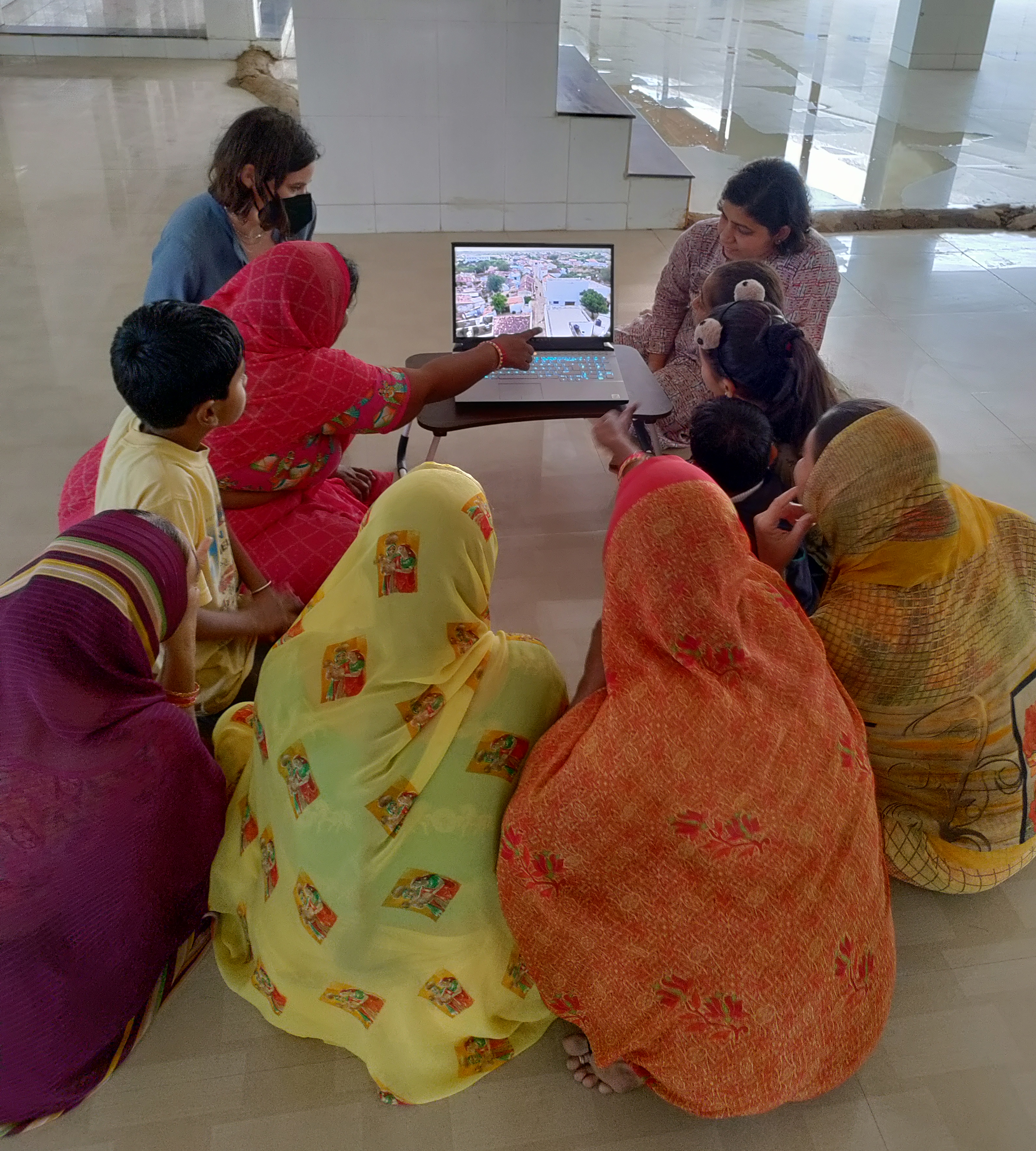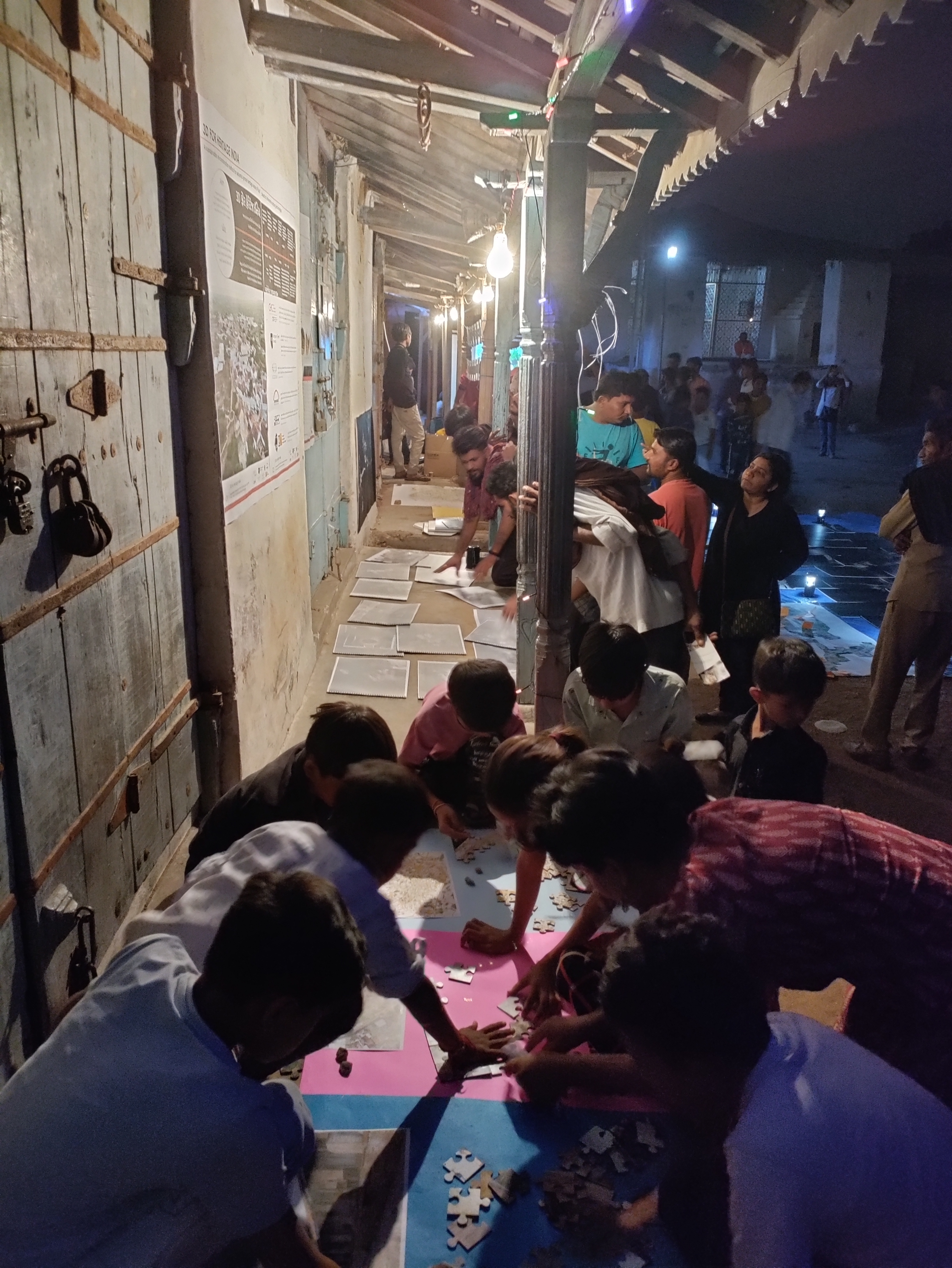 The exhibition consisted of a large plan of Bela at 1 to 100 scale, showing the 18 buildings that were interiorly scanned. For each one of them, a booklet compiling, plus videos, plans and images of individual buildings based on the 3D scan model of the village and the traditional houses of Kutch obtained in June/July 2021. The exhibition also included drone imagery, social survey information, and jigsaw puzzles especially designed for children to play and engage with their environments. This exhibition (held at Bela, Kutch) was then recreated at the CHC CRDF campus in Ahmedabad for CEPT University’s students, along with a seminar for further disseminating and discussing the project.