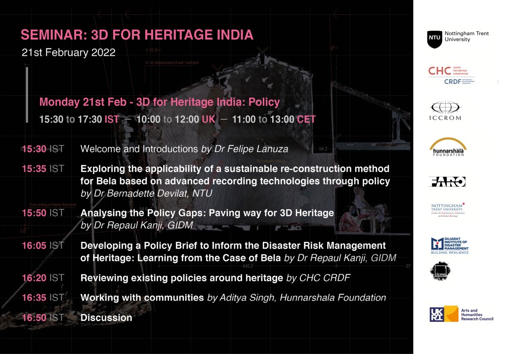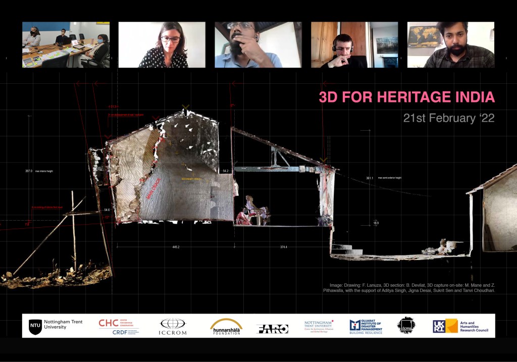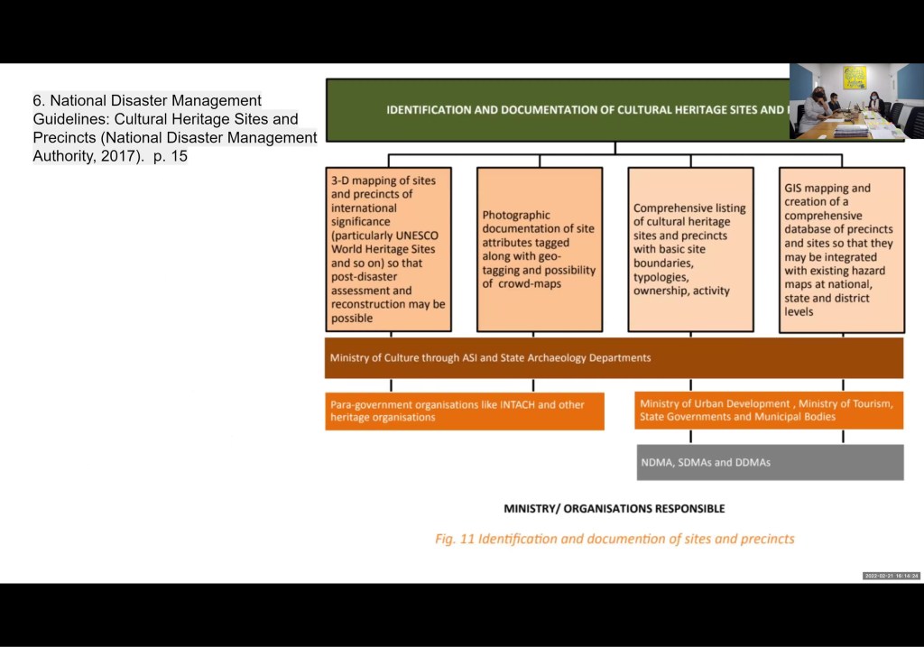 Special thanks to all the presenters and organisers. Dr Bernadette Devilat gave an introduction of the project, covering the aims and potential audience of the Policy Brief, and the relevance of involving three different but complementary perspectives into it: academia, government and local NGOs. From CHC CRDF, Dr Jigna Desai, Mrudula Mane and Zeus Pithawalla presented about current policies around heritage in India. From the Gujarat Institute of Disaster Management (GIDM), Dr Repaul Kanji, shared a relevant perspective on how the project’s methodology could be implemented by analysing current policy gaps and disaster risk management funding. From the Hunnarshala Foundation, Aditya Singh presented previous experiences of reconstruction with focus on the communities in Kutch region. Also, thanks to the CHC CRDF team and Dr Felipe Lanuza (NTU) for organising and actively participating.
