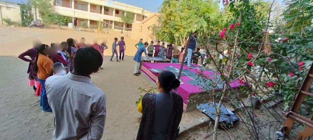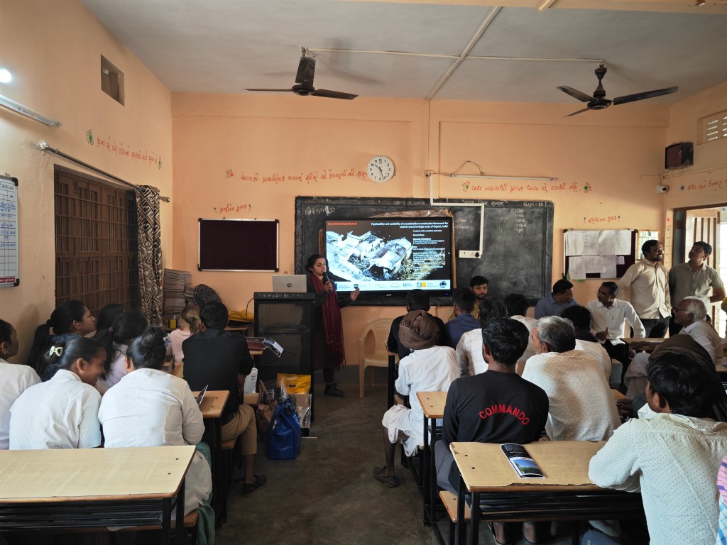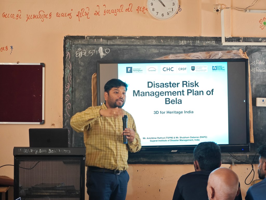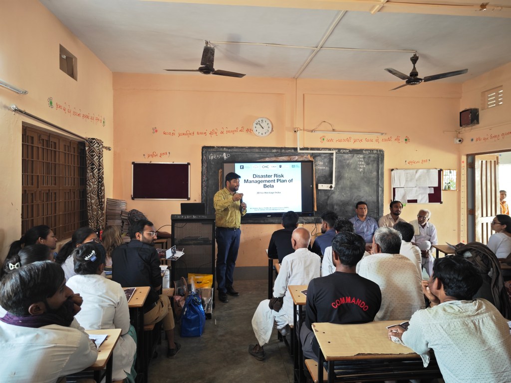 The final part of the activities was led by Shubham Daberao, from the Gujarat Institute of Disaster Risk Management (GIDM), who presented the Disaster Risk Management Plan for Bela that was developed in this last stage of the project. Local authorities, such as the Talati, Medical Staff from the Primary Health Centre, Anganwadi Workers, local officials from Bela Gram Panchayat and teachers from Shree High Secondary School, were also present.